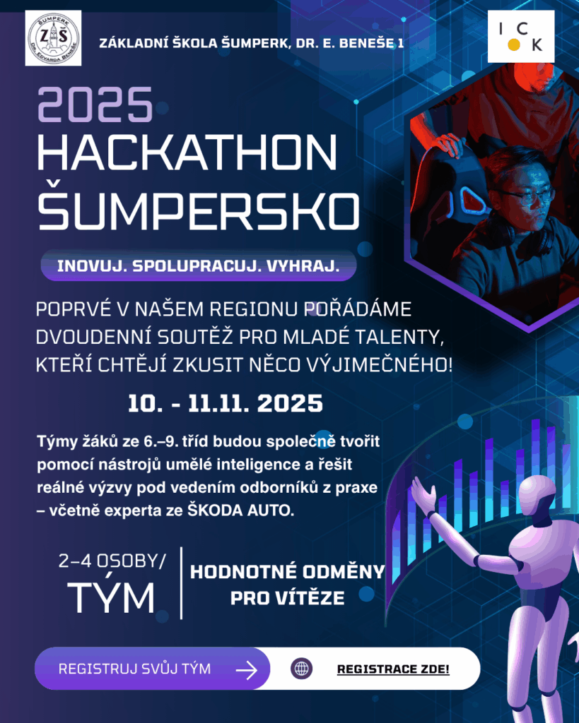Ve dnech 10.–11. listopadu 2025 se na naší škole uskuteční první ročník dvoudenní soutěže Hackathon Šumpersko 2025, zaměřené na využití umělé inteligence (AI).