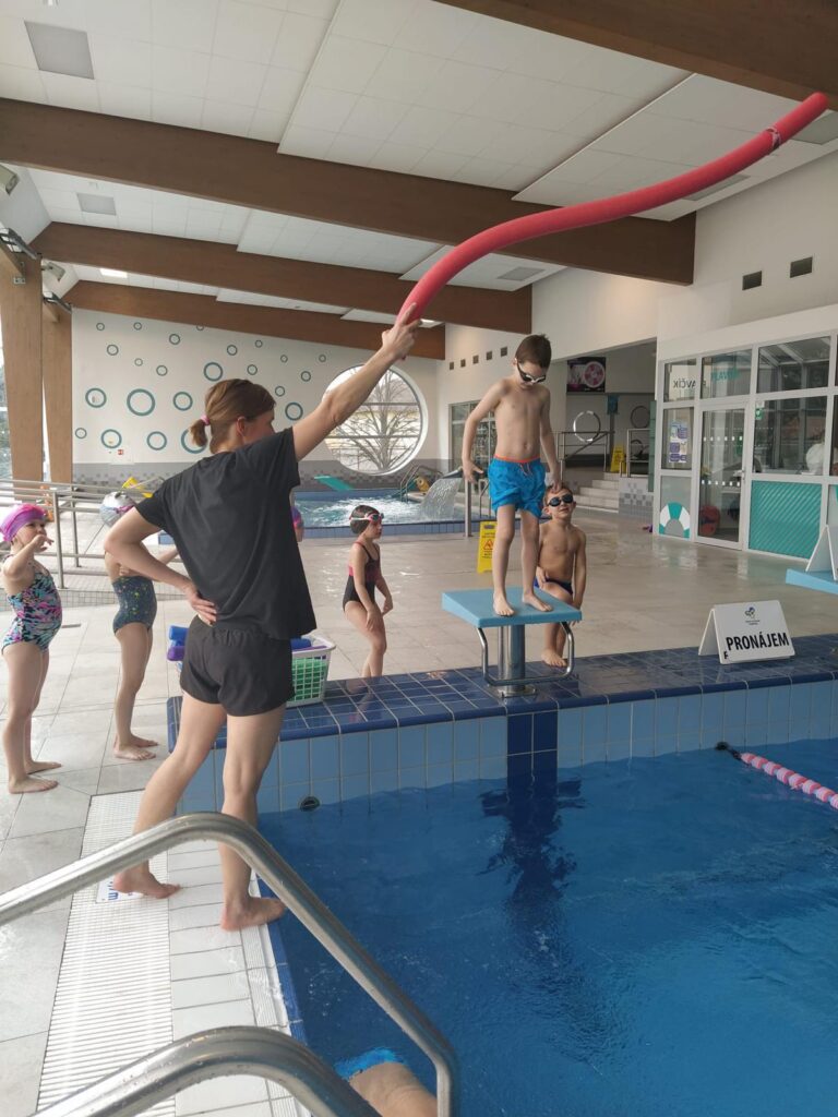 Kromě samotného plavání si děti užívají i spoustu dalších vodních aktivit – skáčou do vody, jezdí na toboganu, loví puky i hračky ze dna a ve vodě jsou stále jistější. 🛝🤿