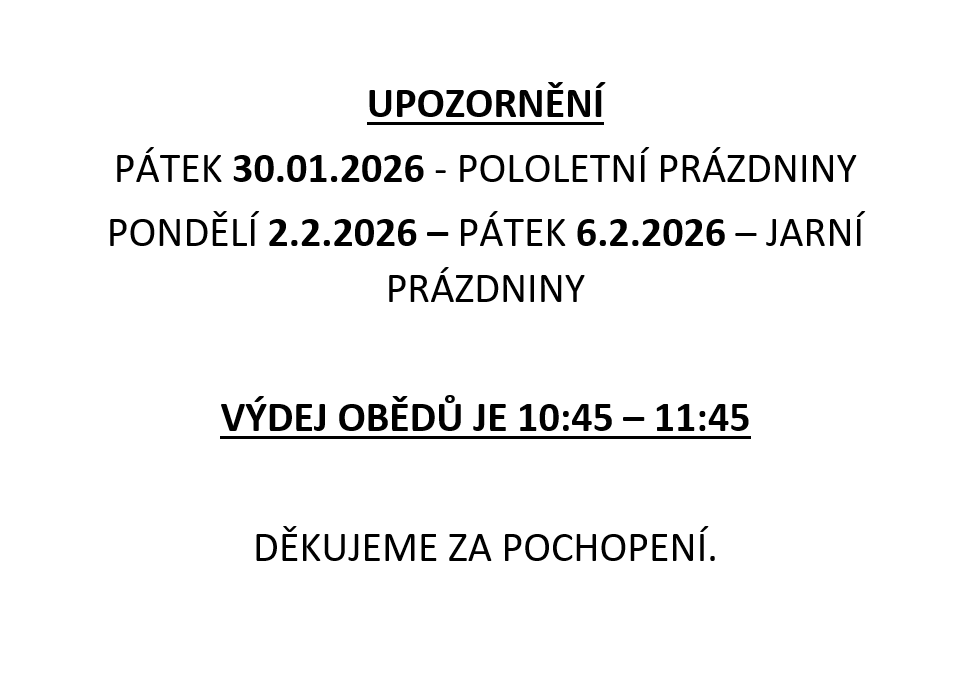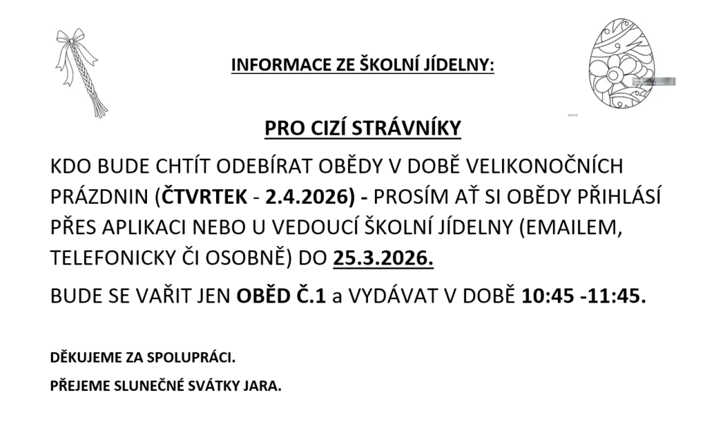 - Obědy pro žáky a zaměstnance školy se vydávají od 11:35 do 14:00 hodin. Cizím strávníkům a nepřítomným žákům z důvodu nemoci se obědy do jídlonosičů vydávají od 10:45 do 11:30. Jídlo je určeno k okamžité spotřebě!