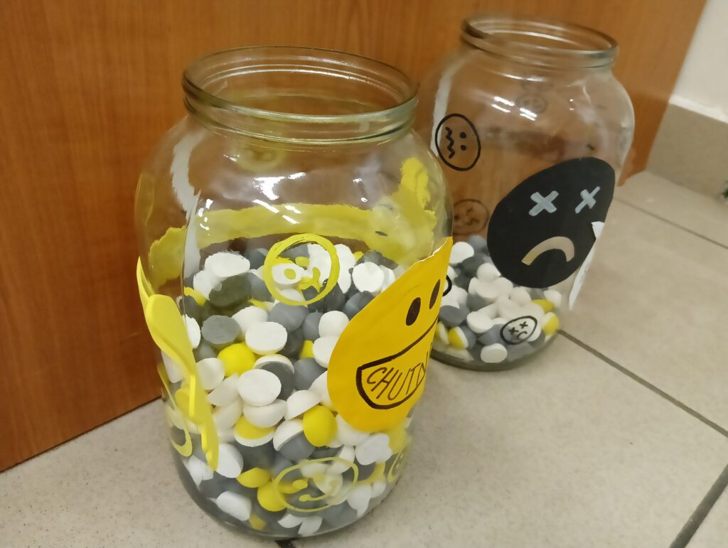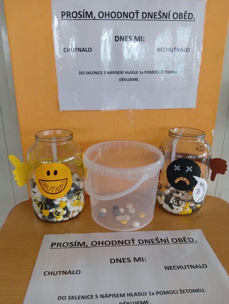 Během měsíce únor mohly naši strávníci hodnotit, zda jim obědy uvařené v naši jídelně chutnaly či nechutnaly, pomocí žetonů, které házely do připravených sklenic. Výsledek – 😊 a ☹ náhodně vyfocených jídel je součástí fotek.