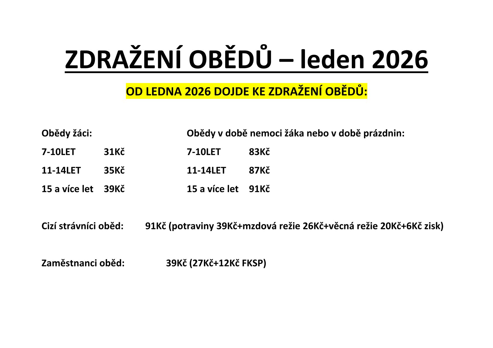 Z důvodu zdražování potravin, které jsou spotřebovávány pro přípravu oběda, dochází od ledna 2026 k navýšení cen za obědy pro naše strávníky.